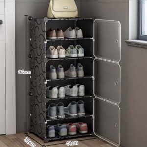 AYSIS Plastic Shoe Rack for Home | 𝟔 𝐒𝐡𝐞𝐥𝐟 DIY Shoe Rack with Door 𝐌𝐚𝐠𝐧𝐞𝐭𝐬 for Home Storage Plastic Box Organizer, Metal Door Frame, Chappal Slipper Sandals Stand (Black, 6-Shelf-3-Door)