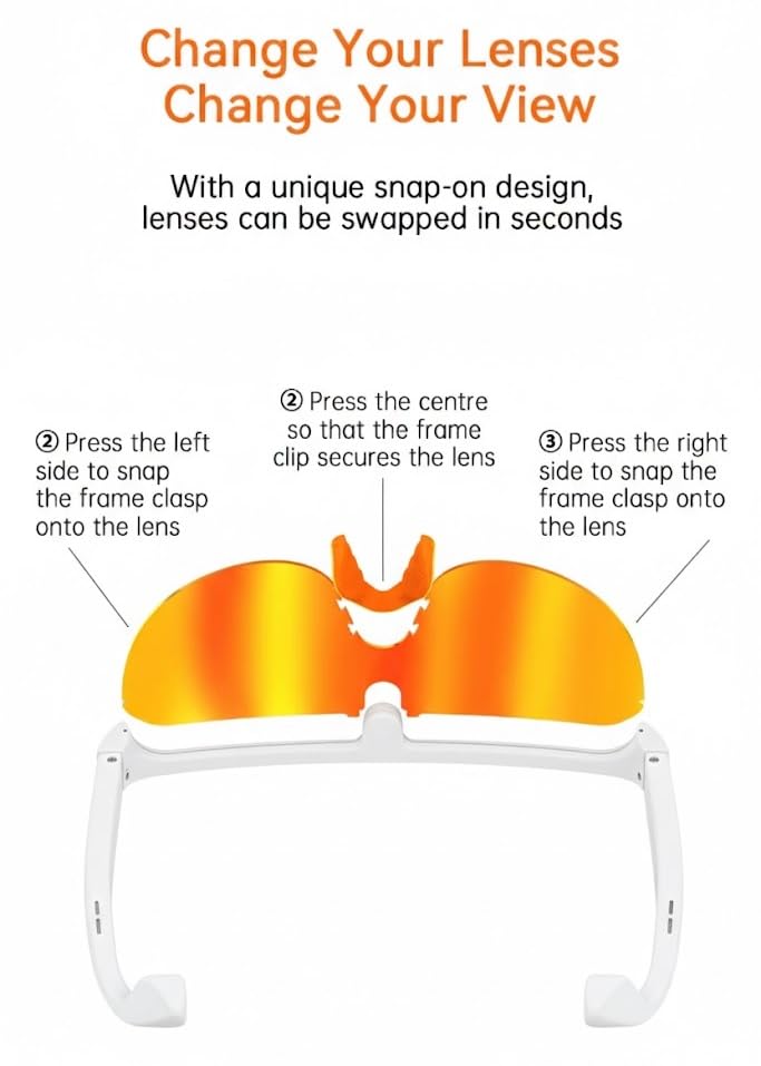 | Feature | 【All-In-One Accessory Kit & Easy Charging】 Everything you need is in the box! Featuring a hassle-free magnetic charging interface, the kit includes the Aeoss Smart Glasses, a secondary yellow lens, a magnetic USB charging cable, a protective carrying pouch, and a microfiber cleaning cloth. |