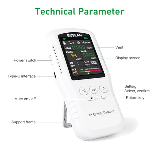 • 【EASY TO OPERATE】Air Quality Detector has a 1500mAh rechargeable lithium battery and packed with Type-C cable that can last up to 4-5 hours. its easy to operate with just pressing the power on/off button, A button realizes all operations,design with LCD Color Screen Digital Display, it can offer mean value for each gas,It helps detect harmful HCHO and TVOC around your room in the real time.