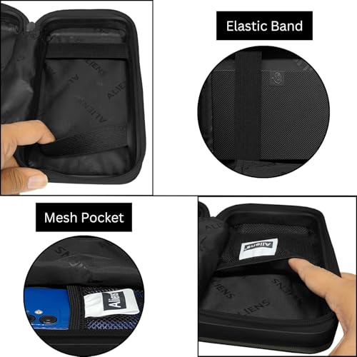 The Aliens Hard Drive Case offers universal compatibility, perfectly fitting all standard 2.5-inch hard drives from leading brands such as Samsung, Toshiba, Seagate, WD Essentials, Western Digital, Sony, Transcend, Lenovo, HP, Dell, Hitachi, and more. With a compact size of 21 x 12 x 8 cm, it also doubles as a versatile gadget organizer—capable of securely holding SSDs, chargers, pen drives, cables, power banks, smartphones, and other small accessories. Whether for daily use or travel, this case keeps your tech essentials neatly arranged and within easy reach. Built from high-quality ABS hard shell material, the case provides excellent durability and impact resistance, while its sleek matte finish delivers a stylish, futuristic look. The smooth-glide zipper, premium stitching, and built-in mesh pocket ensure long-lasting performance and convenient organization. An elastic strap secures your hard drive firmly in place, protecting it from splashes, dust, and accidental bumps. Slim and lightweight, it fits effortlessly into backpacks, laptop bags, or suitcases—making it the perfect portable solution for professionals and travelers alike.