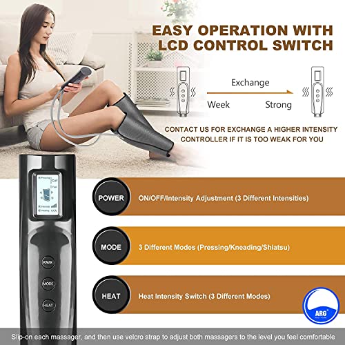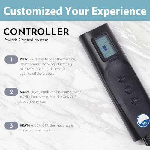 - 👍{𝐅𝐄𝐀𝐓𝐔𝐑𝐄𝐒} The air pressure massager is controlled by an easy-to-use remote. Different modes to choose from Auto mode, kneading mode, press mode, relax mode, cross/calf mode, and foot mode. Heat massage function – low and high. Air pressure intensity control. One size fits most. Breathable mesh lining. Adjustable leg wraps with compression massager for legs and feet.