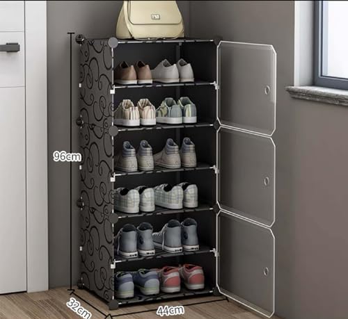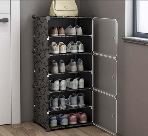AYSIS Plastic Shoe Rack for Home | 𝟔 𝐒𝐡𝐞𝐥𝐟 DIY Shoe Rack with Door 𝐌𝐚𝐠𝐧𝐞𝐭𝐬 for Home Storage Plastic Box Organizer, Metal Door Frame, Chappal Slipper Sandals Stand (Black, 6-Shelf-3-Door)
