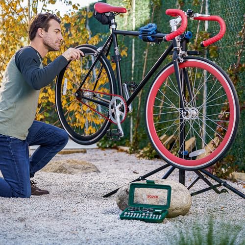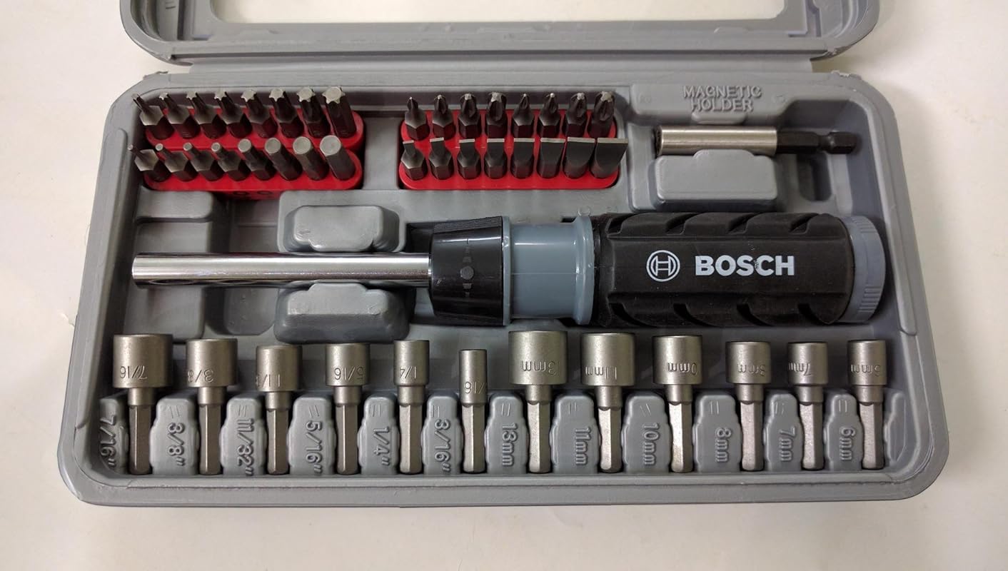 - Scope of Supply: The BOSCH 46-Piece Screwdriver Bit Set features 32 screwdriver bits L = 30 mm, PH 0/1/2/3, PZ 0/1/2/3, S 3/4/4.5/5/6/7/8/9, HEX 1.5/2/2.5/3/4/5/5.5/6, T 8/10/15/20/25/27/30/40, 12 nutsetters for hex screws, 3/16″, 1/4″, 5/16″, 11/32″,3/8″,7/16″,, 6, 7, 8, 10, 11, 13 mm, 1 universal holder, magnetic, 1 hand screwdriver, ratchet function, clockwise/counter-clockwise, bit garage in the handle.