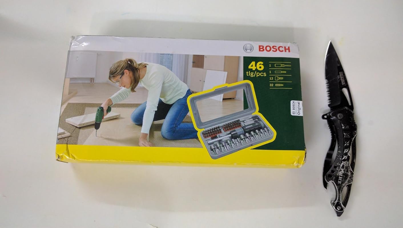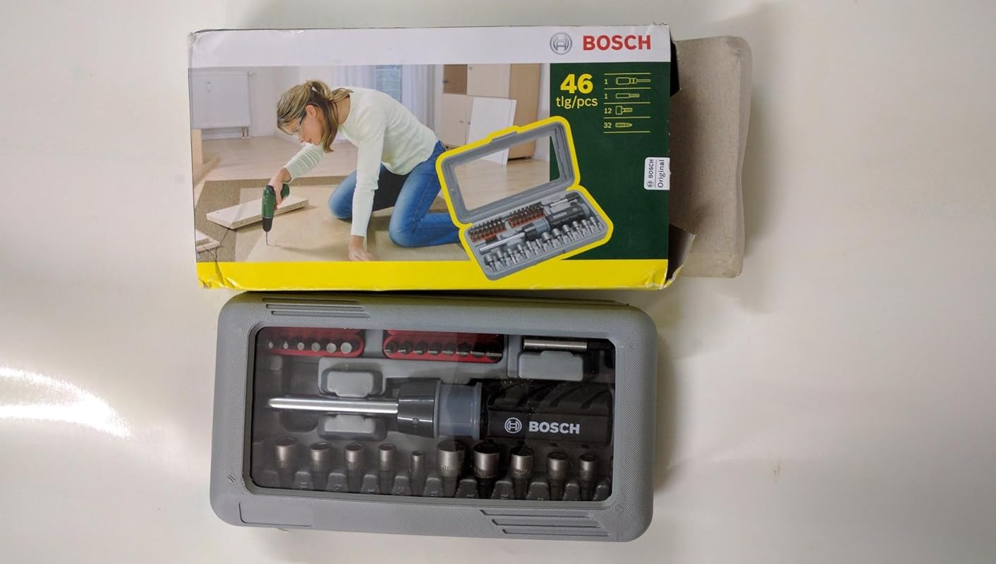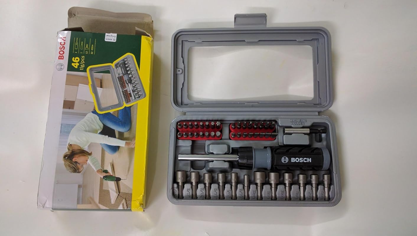 Feature | Scope of Supply: The BOSCH 46-Piece Screwdriver Bit Set features 32 screwdriver bits L = 30 mm, PH 0/1/2/3, PZ 0/1/2/3, S 3/4/4.5/5/6/7/8/9, HEX 1.5/2/2.5/3/4/5/5.5/6, T 8/10/15/20/25/27/30/40, 12 nutsetters for hex screws, 3/16", 1/4", 5/16", 11/32",3/8",7/16",, 6, 7, 8, 10, 11, 13 mm, 1 universal holder, magnetic, 1 hand screwdriver, ratchet function, clockwise/counter-clockwise, bit garage in the handle. |