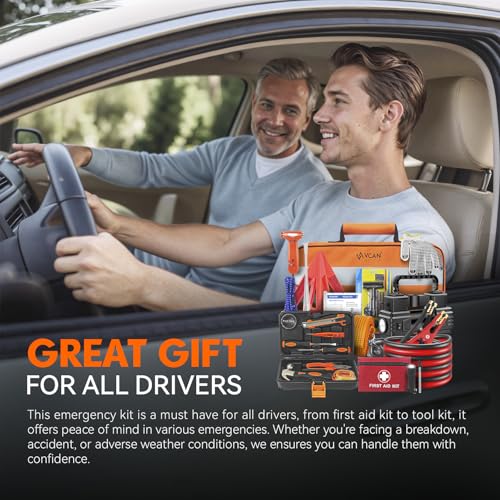 Car Emergency Kit with Portable Air Compressor, First Aid Kit, Jumper Cables, Roadside Safety Emergency Tool Kit for Women, Men, Teen