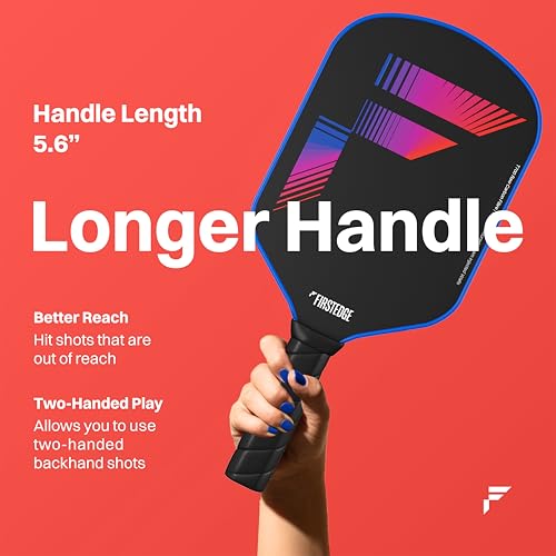 - ELONGATED HANDLE DESIGN: 5.6 inch extended handle provides increased reach and allows for two handed play using the pickleball paddle for better backhand shots.