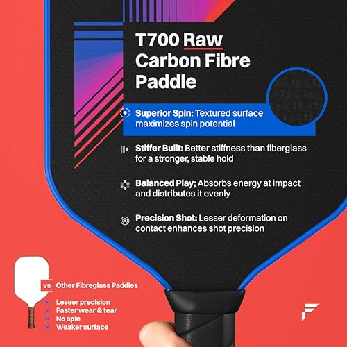 - T700 RAW CARBON FIBRE: Advanced Carbon Friction Surface (CFS) combined with T700 RAW Carbon Fiber material in thie pickle ball racket, increases friction to maximise spin & ball control. CFS technology provides a more advanced, durable and longer lasting friction surface. Premium Carbon Fibre strengthens the paddle & provides a crisp feel with greater energy return.