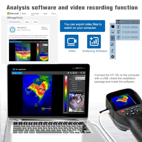 - Efficient Data Storage and Transfer: Easily capture and store photos in jpg format and videos in mp4 format, and effortlessly transfer data to your computer via USB for further analysis with the included Thermal Imaging Image Analysis Software.