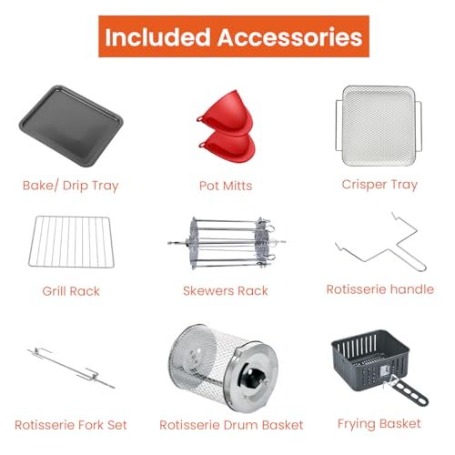 1N Bake/ Drip Tray, 1N Rotisserie Handle, 1N Rotisserie Folk Set, 2N Pot Mitts, 1N Recipe Booklet, 1N Instruction Manual cum Warranty Card, 1N Main Unit, 1N Crisp Tray, 1N Rotation Drum Basket
