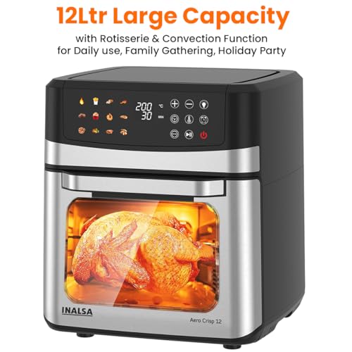 INALSA Air Fryer Oven|12L,1700W|Stainless Steel Body|12-in-1 Functions,Fry,Bake,Grill,Dehydrate&Reheat|12 Preset|Rotisserie&Convection|Dishwasher Safe Accessories|2Yr Warranty,2025Model AeroCrisp