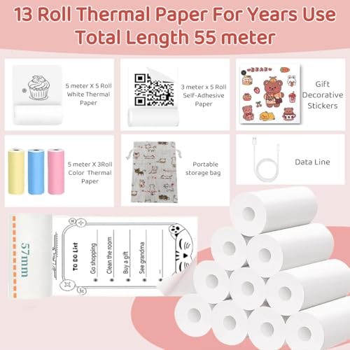 Zeitel® Mini Bluetooth Thermal Printer, Portable Label Printer Inkfree Printer for Android & iOS System, Black on White Thermal Printer with 13 Roll of Print Paper, Stickers, Pink