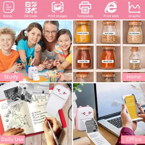• STYLISH CARTOON BLUETOOTH PRINTER: Our bluetooth thermal printer is USB charing, built in 1200mAh battery, can be powered by powerbank or connecting any adapter. Perfect for labeling file folders, food storage, organizing clothes, food containters, jars, bottles, etc. Cute cartoon design of also adds a touch stylish to this printer, making it a nice gift for students, kids, and anyone who values the functionality and fashion.